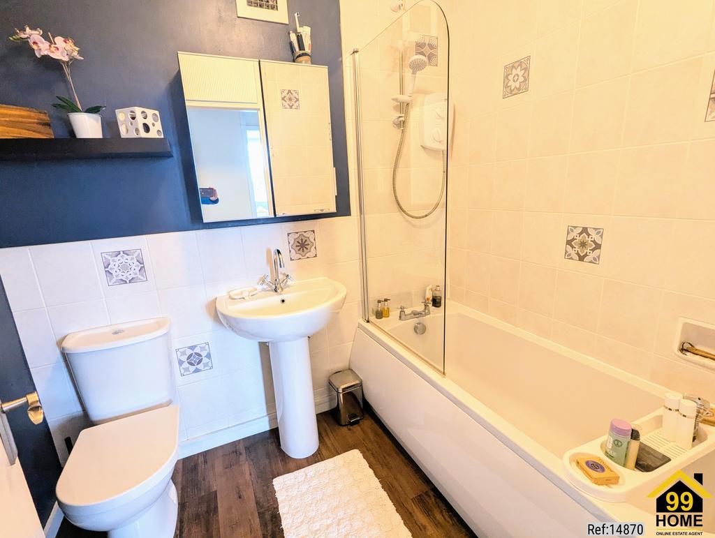 The family bathroom is well-appointed with a bath, overhead shower, toilet, wash basin and extractor fan.