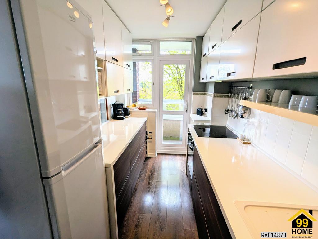 Beautifully appointed modern kitchen with a combination of high gloss white worksurfaces and white upper cupboards with dark wood lower cupboards. Door to shared balcony with picturesque views over the trees, ample storage in a range of wall and base units, electric hob and oven, sink and drainer, microwave, washing machine, dishwasher, fridge and freezer.