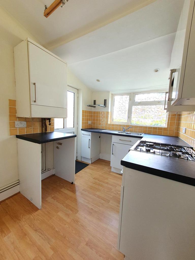 Stripped pine door. Built in wall and base level work units with roll top work surfaces, stainless steel sink and drainer with mixer tap, freestanding gas oven and hob, appliance space for fridge freezer and washing machine, extractor fan, part tiled walls, laminate flooring, radiator and double glazed window to the rear aspect. Door to back garden. Door to storage area / passageway.