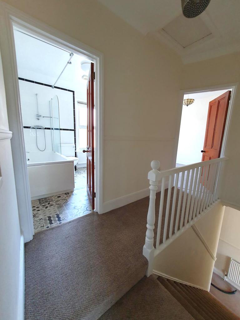 Has access to the loft via hatch, radiator, carpet flooring, doors to two bedrooms and bathroom.