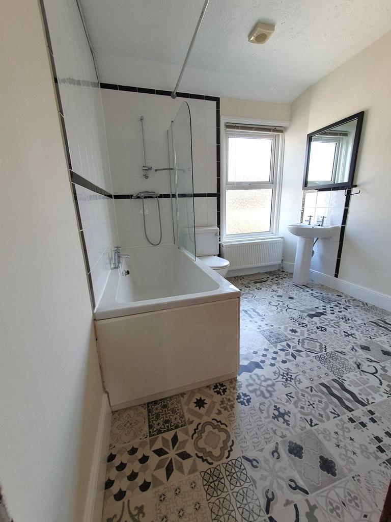 With a stripped pine door and with plenty of space for cupboards and shelves It has a large double ended bath, pedestal wash basin and low level wc, extractor fan, radiator and double glazed window to the rear.