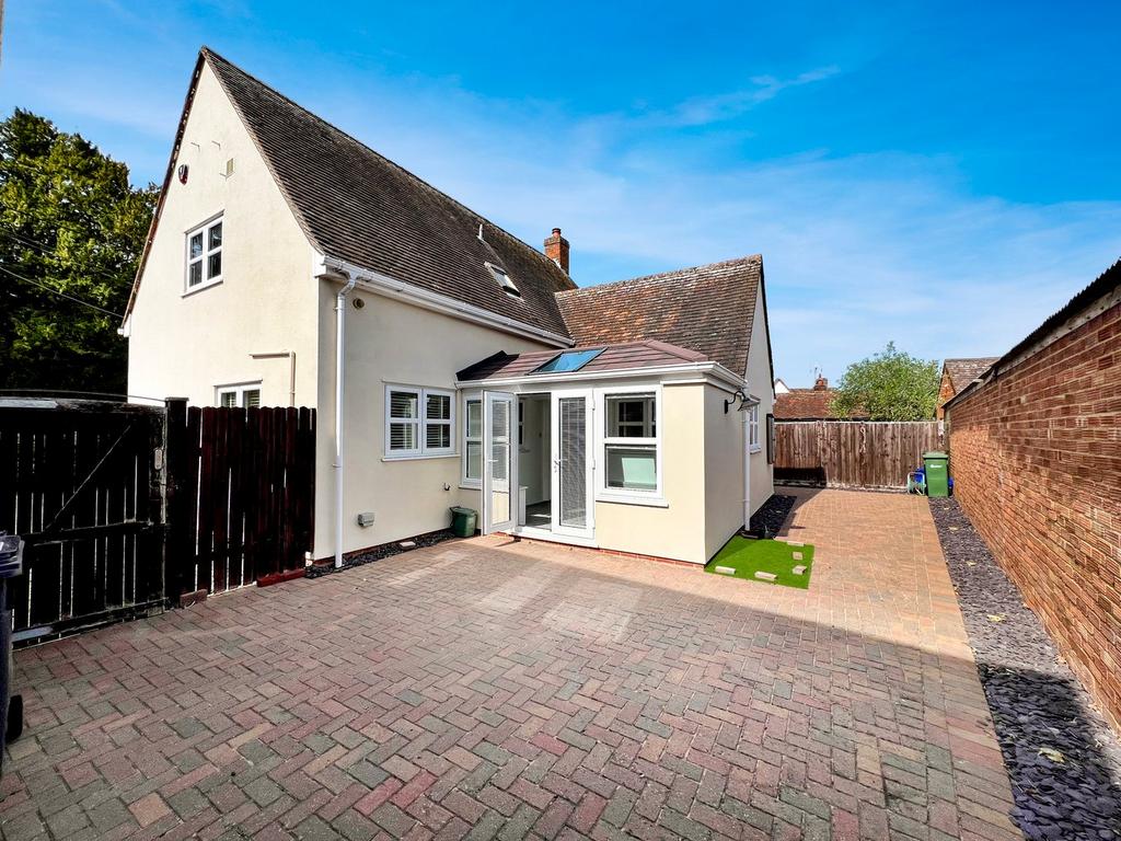 Outside, the property offers ample parking arranged in an L-shape across the front and side. Dual pathways lead to the rear garden — a compact yet very private outdoor space laid with block paving, complete with external lighting and power. The garden also houses a modern oil tank with a 1,220-litre capacity.