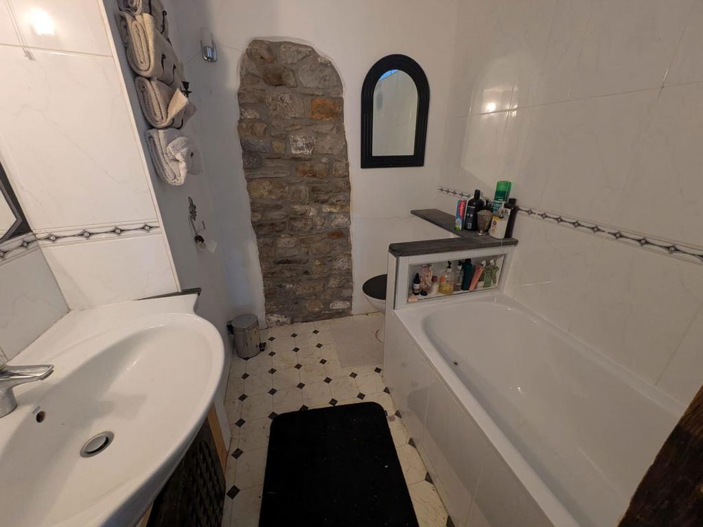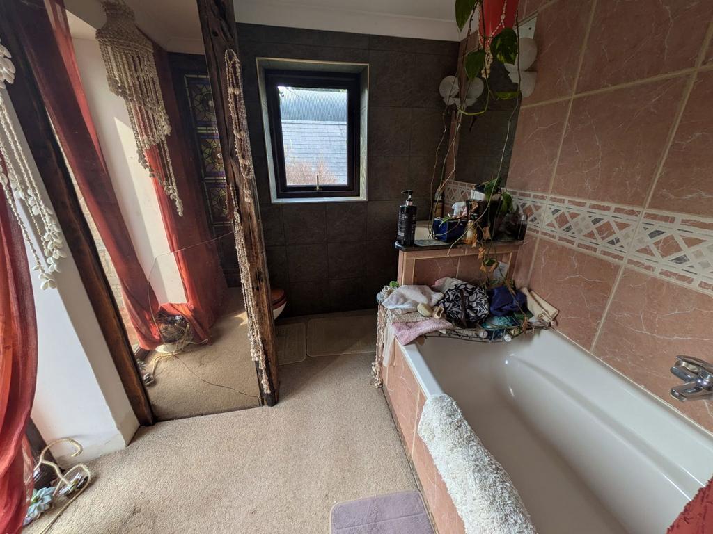 Dual aspect double glazed windows, feature colour-glass panel to left of entrance. Suite comprises tiled panelled bath with Mira shower over, counter top wash hand basin, WC, part tiled walls, wooden beam to ceiling.