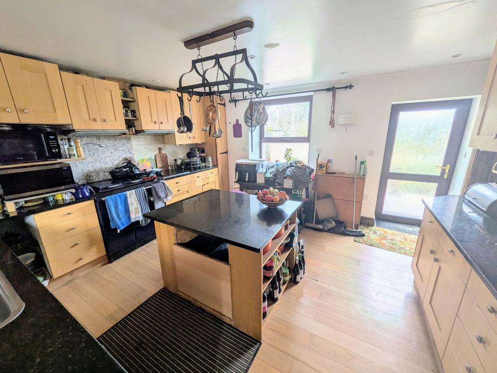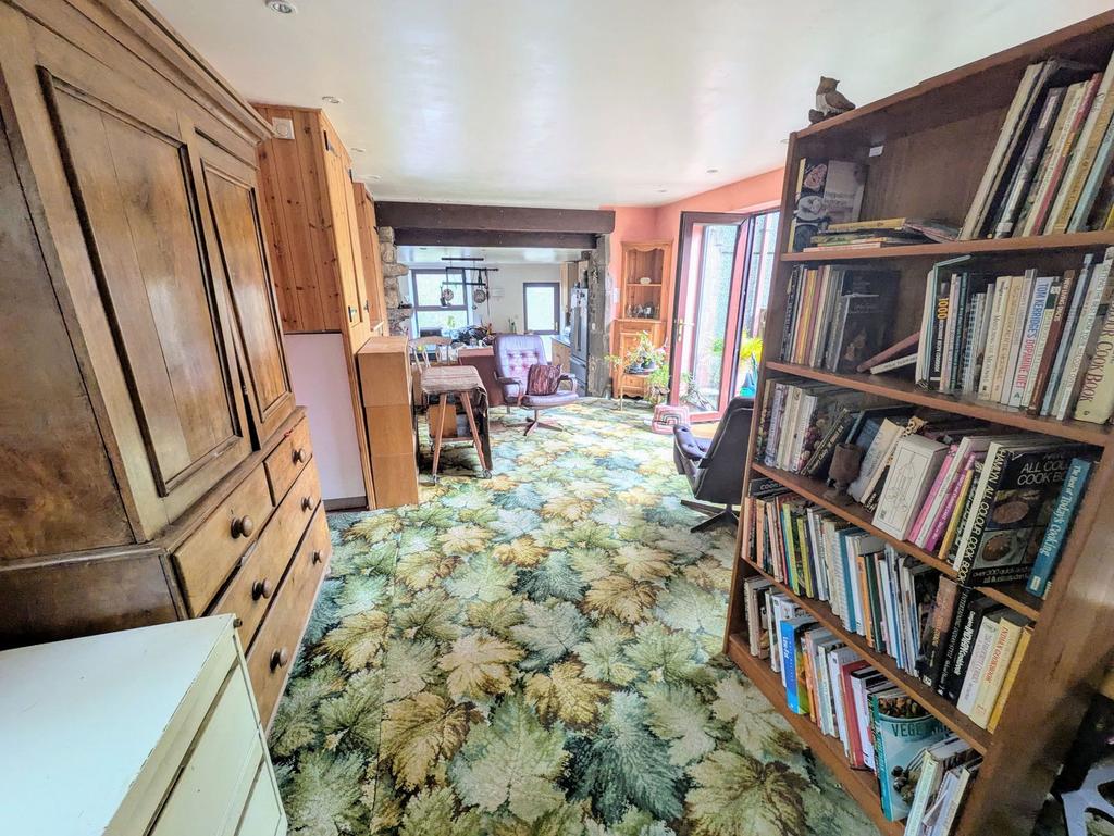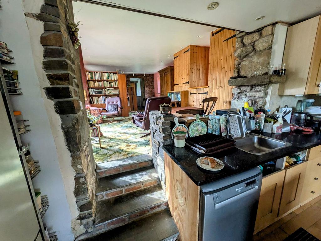 Dual double glazed glass panel doors to the rear of the property, tiled floor, fitted with wall and base units, single bowl sink unit and draining board, plumbing for washing machine, double panel radiator, walk-in pantry with double glazed window. Dual double glazed glass panel door to alleyway with storage shelves leading to the Stone Barn.