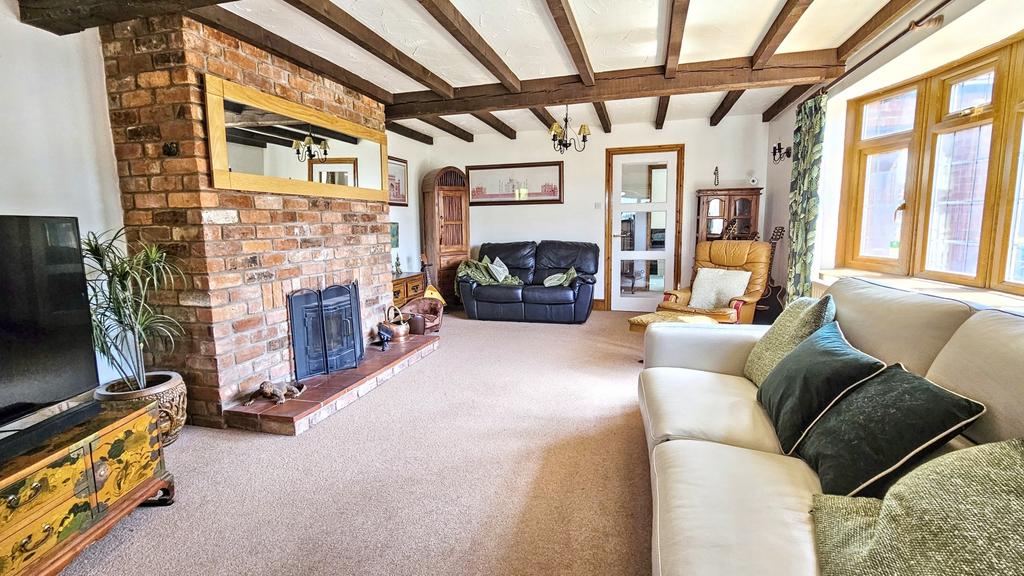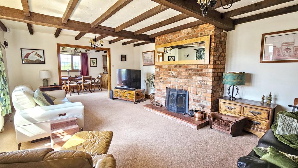 LIVING ROOM with fitted carpet, exposed ceiling beams, front bow window with deep sill and extensive views towards the Long Mynd Hills. Brick fireplace and chimney breast with tiled hearth and log burner. Two wall light fittings, radiator, two tv aerial points, four power points, door from reception hall and square archway to:-