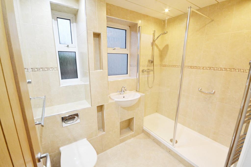 Two double glazed windows to side, walk-in shower with thermostatic shower unit, hand wash basin and hidden cistern WC in tiled surround with three display niches for products. Chrome towel rail, PVC cladding to ceiling, tiled flooring