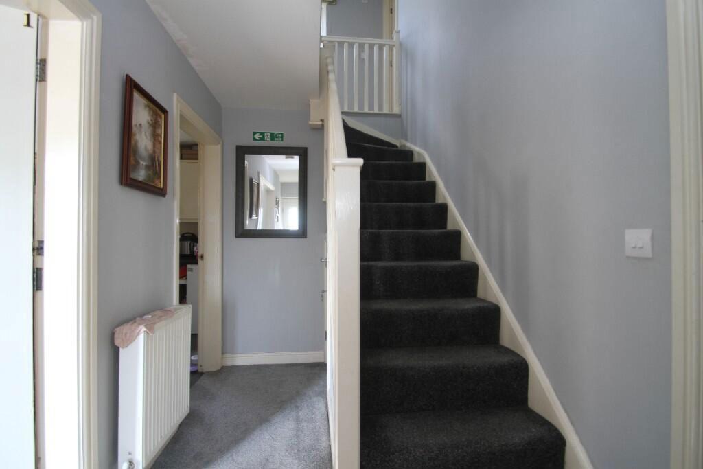 Carpeted flooring with inset door mat, double panel radiator, enclosed lighting and smoke alarm to ceiling. Small panelled door leads into under stairs store cupboard also with carpeted floor and light fitting.