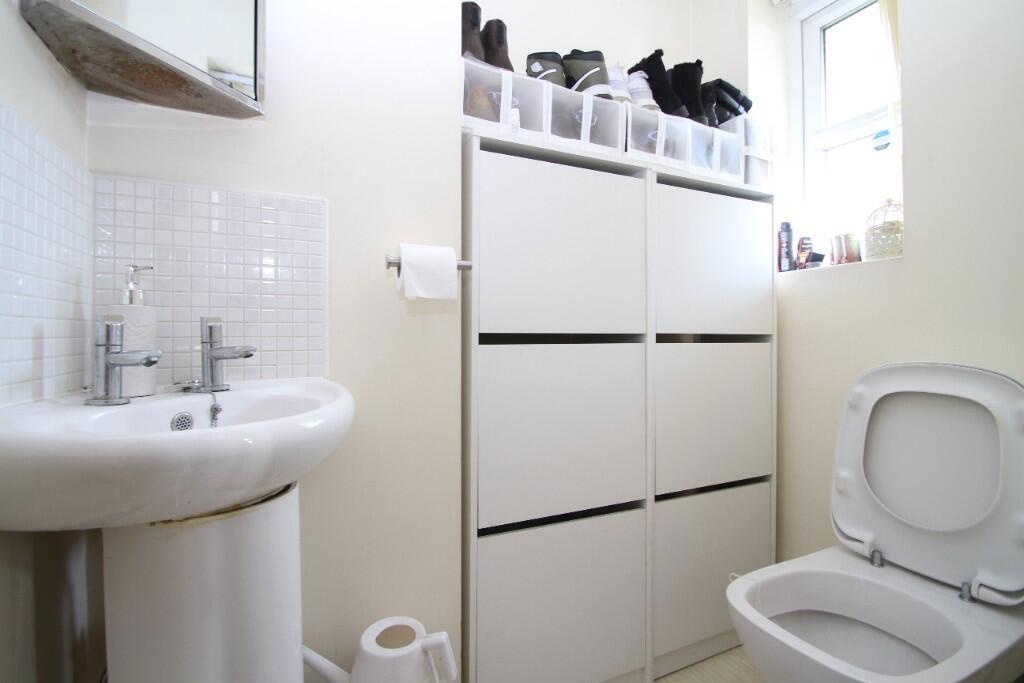 Lino flooring, enclosed light fitting to ceiling, double glazed window with obscured glass to front elevation and wall mounted fuse board. Suite comprises of: - low level flush toilet and corner pedestal wash basin with taps and partly tiled walls as splashback. From hallway, double doors to left-hand side leads into: -