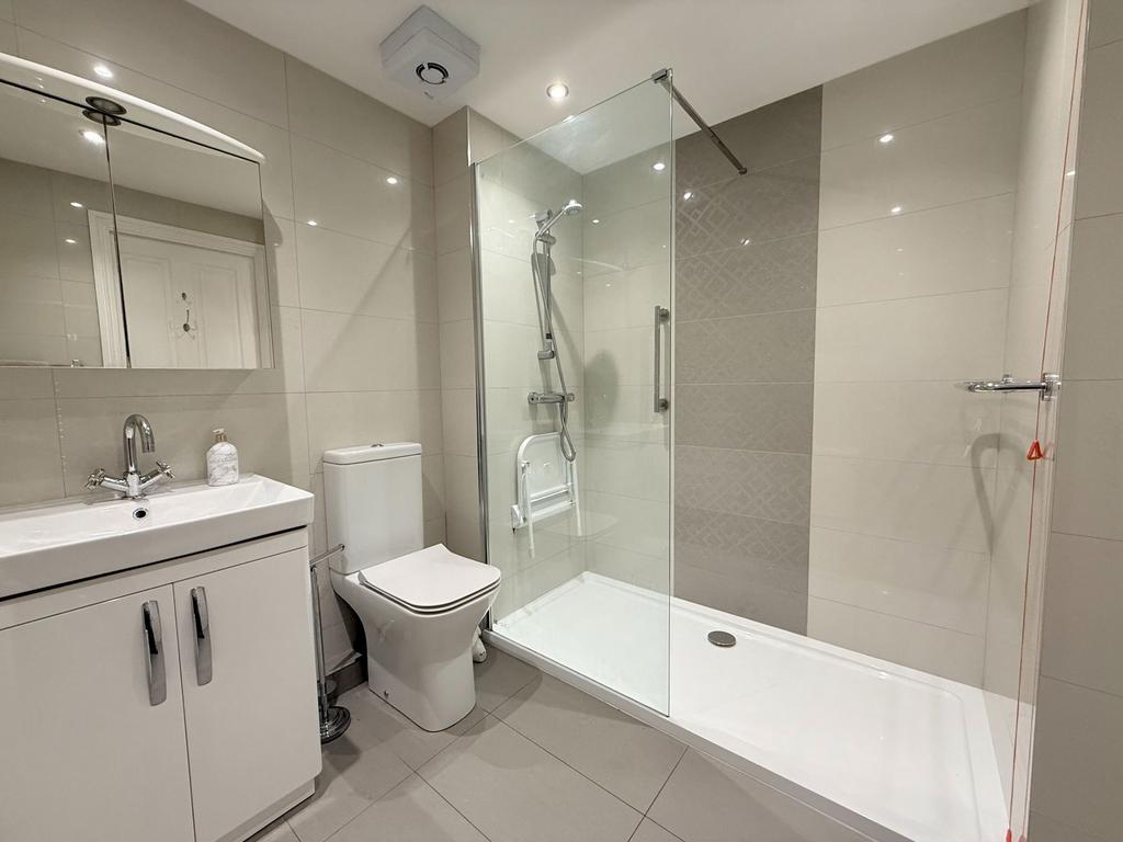 Having an over-sized walk-in shower enclosure with thermostatic shower, grab rail and wall mounted seat, emergency pull-cord, vanity wash hand basin with storage below and low level flush toilet, complementary tiling to walls and floor, ceiling spot-lights, extractor fan and ladder style radiator