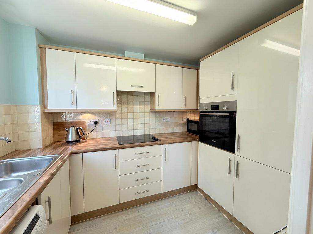 Having high gloss wall and base units with wood effect laminate work surfaces, sink and drainer unit, tiling to splash-backs, Hoover four ring electric hob with extractor fan over, inset eye level Bosch oven, integrated fridge and freezer, space and plumbing for a washing machine, under-cupboard lighting, ceiling light point, wood effect flooring, wall mounted electric heater, emergency pull-cord and double glazed window to the side elevation