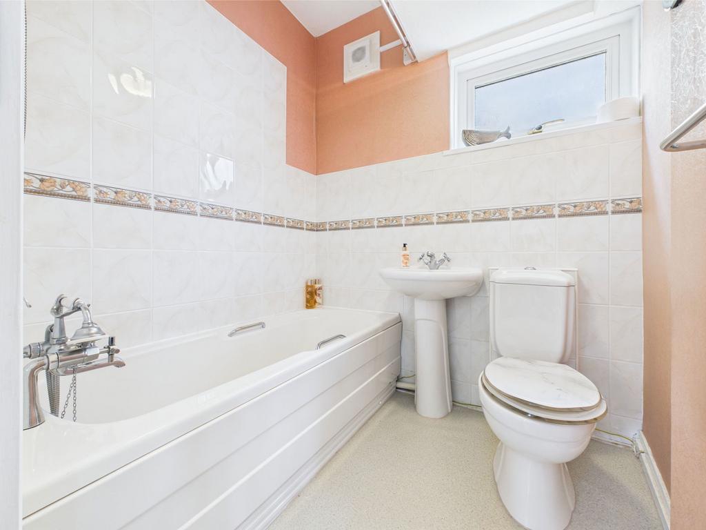 BATHROOM/WC - 8' 1" x 7' 7" (2.46m x 2.31m) Comprising panelled bath with twin hand grips and electric shower over, pedestal wash hand basin, close coupled WC, tiled walls, airing cupboard housing hot water cylinder with slatted shelving over.