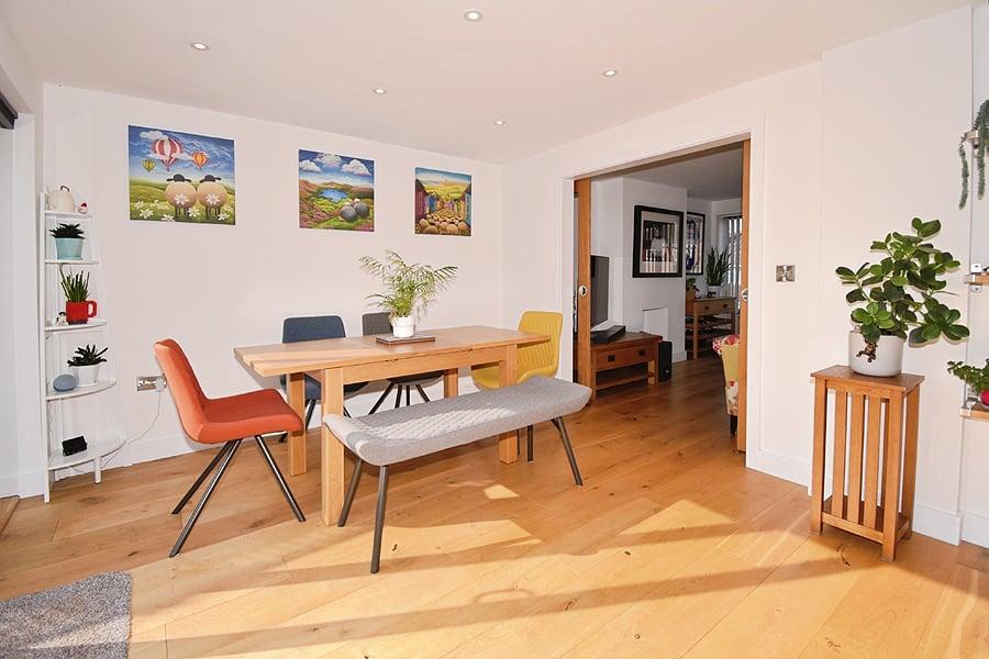 16’8” (5.08m) maximum x 13’0” (3.96m). A light and spacious room. Engineered oak wood flooring incorporating underfloor heating. Telephone point. Television aerial point. Understair storage cupboard. Fireplace recess. Stairs rising to first floor. Thermostat control panel. uPVC double glazed window to front aspect. Glass panelled oak wood double sliding doors opening to: