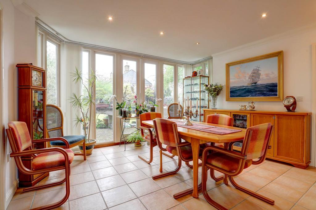 Further to the ground floor is the dining room, that leads nicely into the heart of the home in the kitchen/dining room. Well-appointed with sleek cabinetry, integrated appliances, and a central island, the space opens directly onto the beautifully maintained garden ideal for indoor-outdoor living.