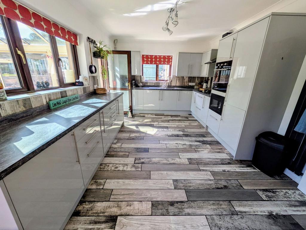 Double glazed window to side, double glazed windows to rear, fitted with a range of wall & base units, fridge/freezer, eye-level oven, microwave, gas oven, extractor fan, over, part tiled walls, tiled floor, double glazed door to conservatory: