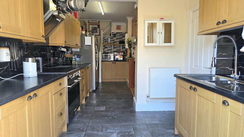 The heart of the home features an open-plan kitchen diner, complete with a modern design and a second log burner, perfect for those chilly evenings. French doors lead you out to the rear garden, seamlessly connecting indoor and outdoor living spaces. Just off the kitchen, you'll find a separate utility room that includes a downstairs WC, which has the potential to be transformed into a domestic bathroom, offering flexibility for your needs.