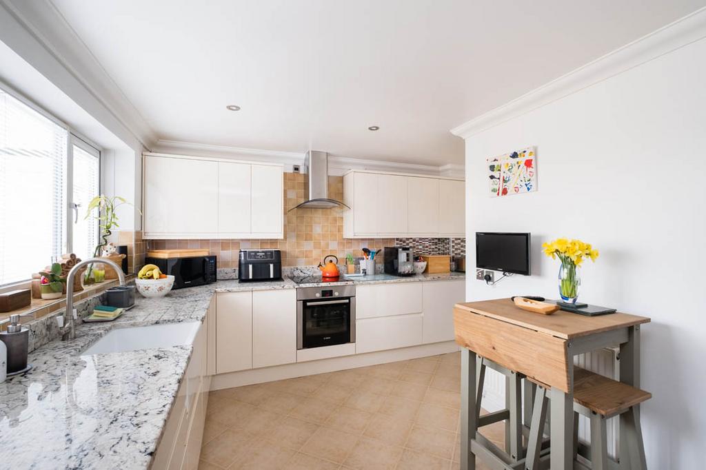 The kitchen sits to the rear of the property and has been updated with sleek, modern base and wall units and granite worktops. There is a useful walk-in larder, built-in oven with induction hob and overhead extractor fan. A Belfast sink overlooks the rear garden. The kitchen leads directly into an additional, versatile space - currently used as a sun room but could be used for separate dining, home office, craft room or children’s playroom. A door leads out onto the rear patio.