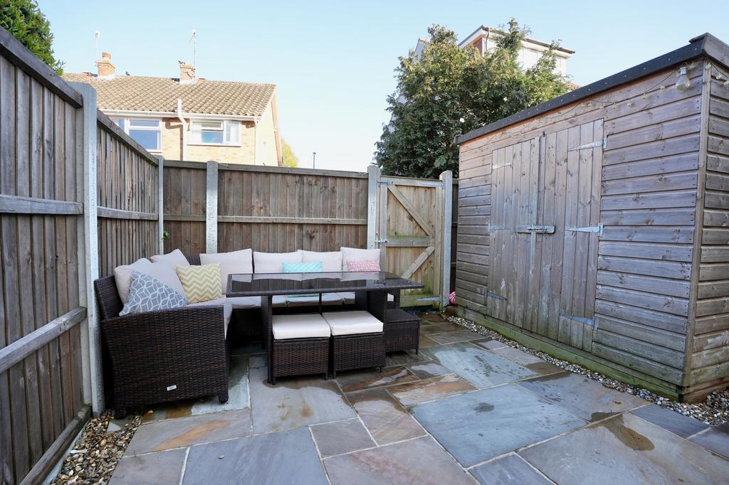 To the rear of the property is the fully enclosed rear garden with mainly laid to patio with gravel borders, a raised further patio area and a timber garden shed. A timber gate provides access to the rear right-of-way.