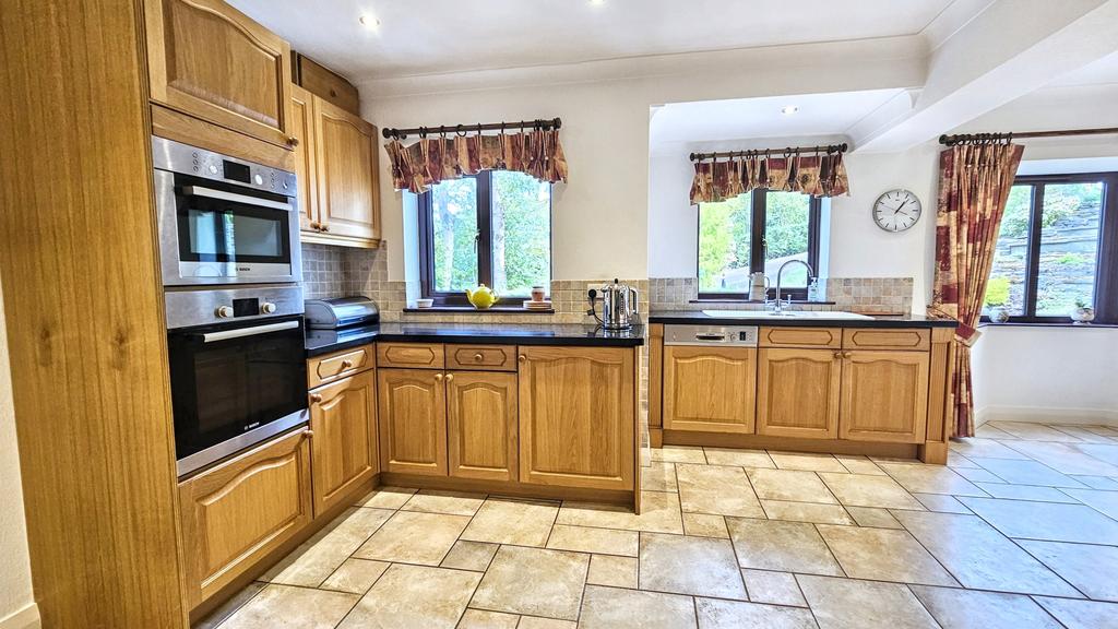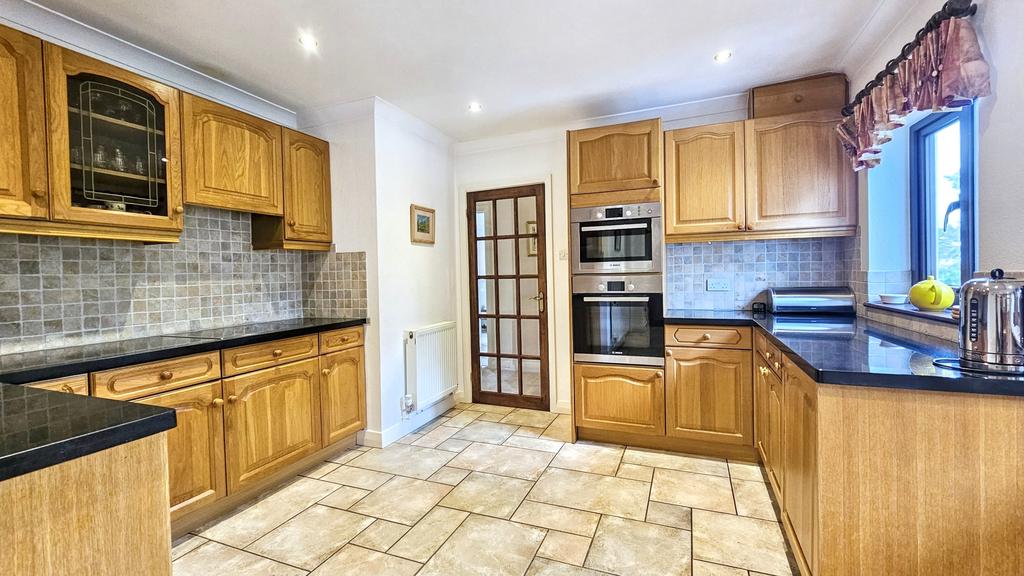 Spacious KITCHEN/BREAKFAST ROOM(7m x 4.6m approx)(22'9" x 15' approx) with tiled floor, coving, ceiling lights, ample power points, substantial range of built-in units with wood faced floor cupboards including drawers and matching wall cupboards including one glass fronted china cabinet. Enamelled sink unit, onyx work surfaces with tiled splashbacks, integrated Bosch dishwasher, integrated fridge, 'Bosch' four ring ceramic hob and Bosch' high level double oven. Radiator, telephone point, bay window and three further windows. Door to utility.