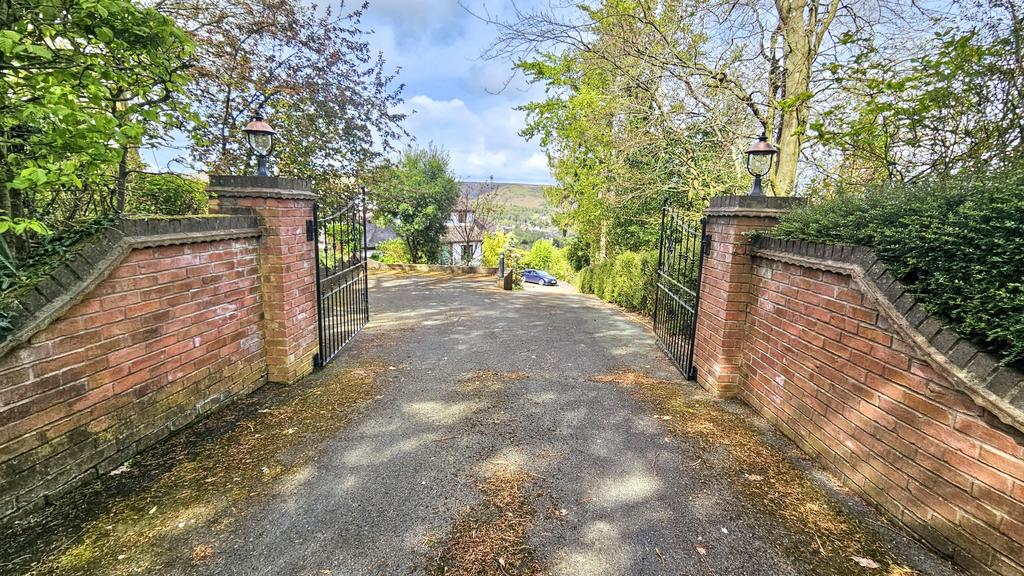 OUTSIDE: The Property is approached through double wrought iron gates with brick pillars and walling either side and lanterns. The tarmac driveway provides ample parking space again illuminated which gently slopes to the two garages.