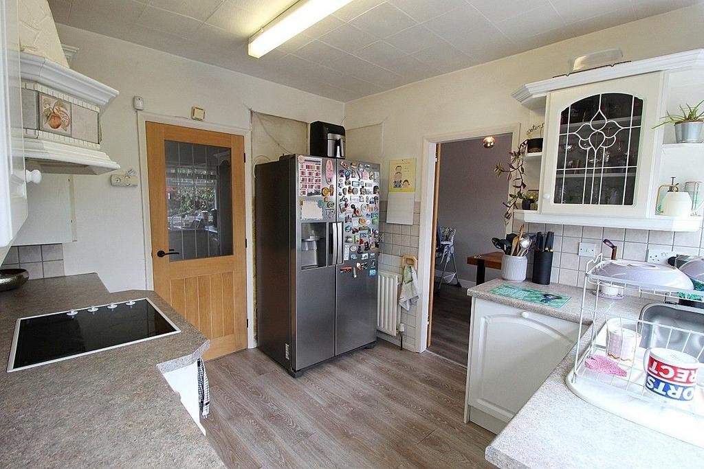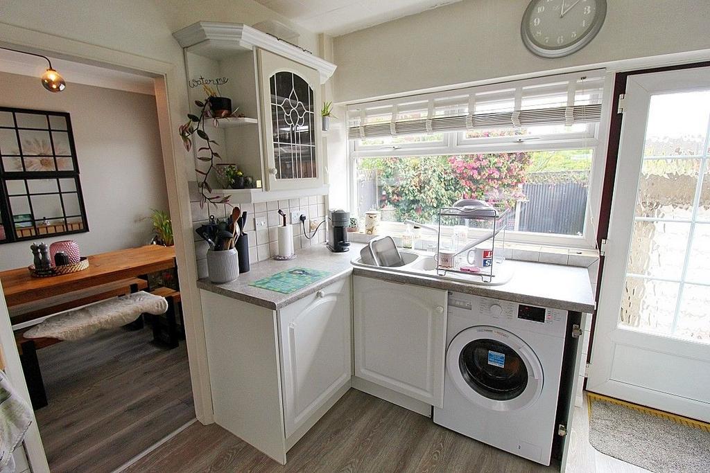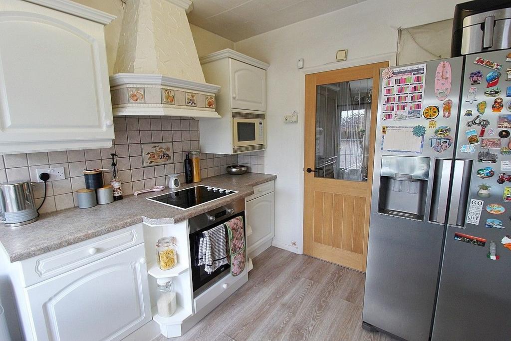 Fitted wall and base units, an electric oven and hob with an extractor above, and worktops with a tiled splashback. There’s space for appliances, a rear-facing window, and a glass-paneled door leading to the garden. A radiator completes the room.
