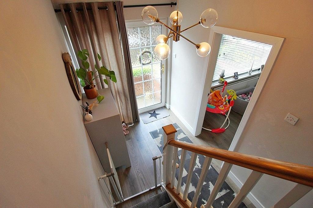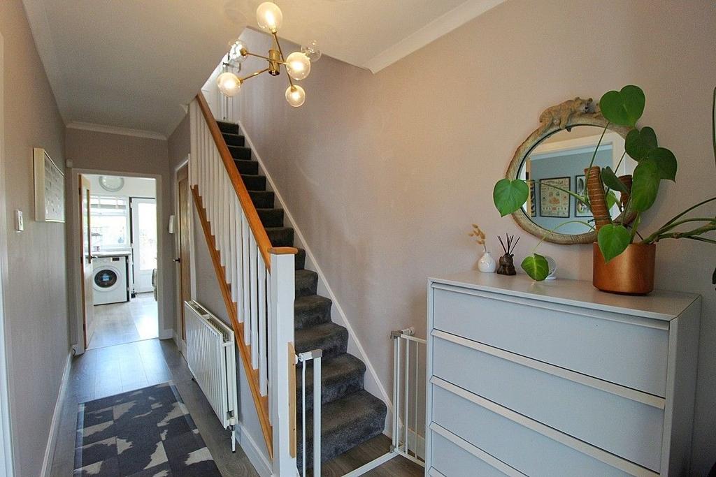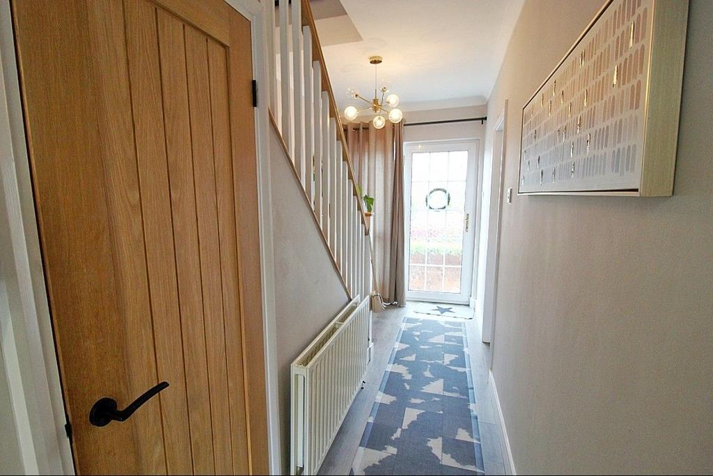 A glass-panelled door opens into the entrance hall, featuring laminate flooring and a radiator. Carpeted stairs lead to the first floor, with a storage cupboard beneath. Oak doors provide access to the lounge and kitchen.
