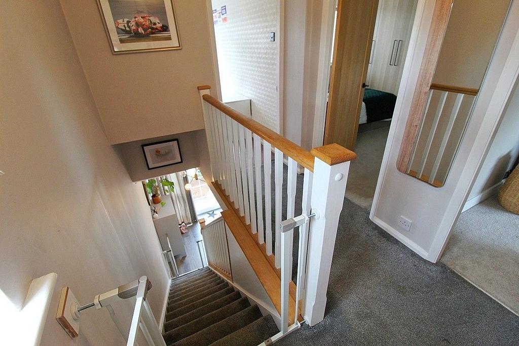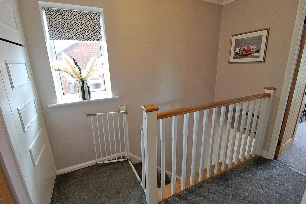 Carpeted flooring, a side window, and a wooden banister with spindles enhance the staircase. A loft hatch provides access to additional storage. Oak doors lead to three bedrooms and the bathroom, while a storage cupboard houses the boiler.
