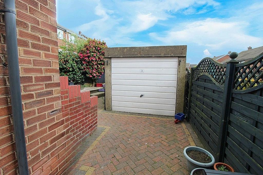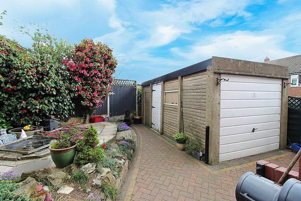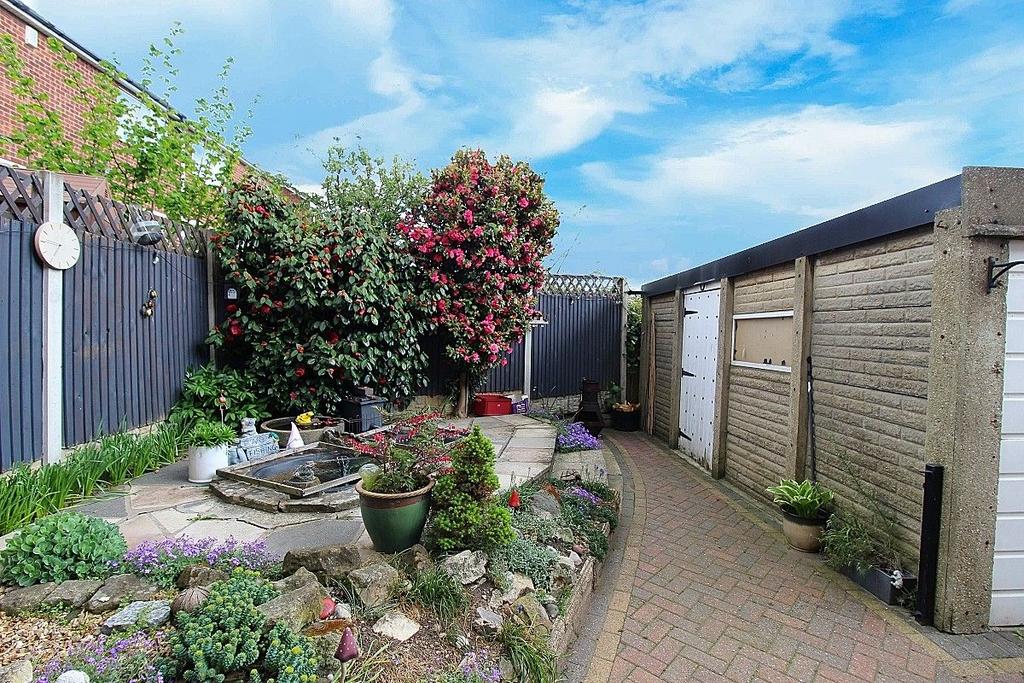 To the front, a block-paved driveway provides off-street parking, with a paved area and a shrubbed border. A privacy wall surrounds the property. At the rear, a detached garage sits alongside tiered paving with a central pond, bordered by shrubs and trees, and fully enclosed with fencing for added privacy.