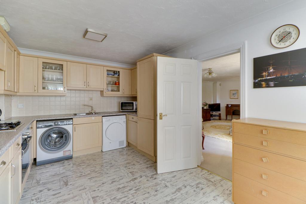 textured and coved ceiling, double glazed windows, double glazed door onto terrace, a range of wall and base mounted units with roll top work surfaces over with inset stainless steel sink and drainer. Integrated fridge freezer, integrated gas hob and electric oven with extractor fan over. Space for washing machine and dishwasher. Wall mounted gas boiler, radiator and laminate flooring.