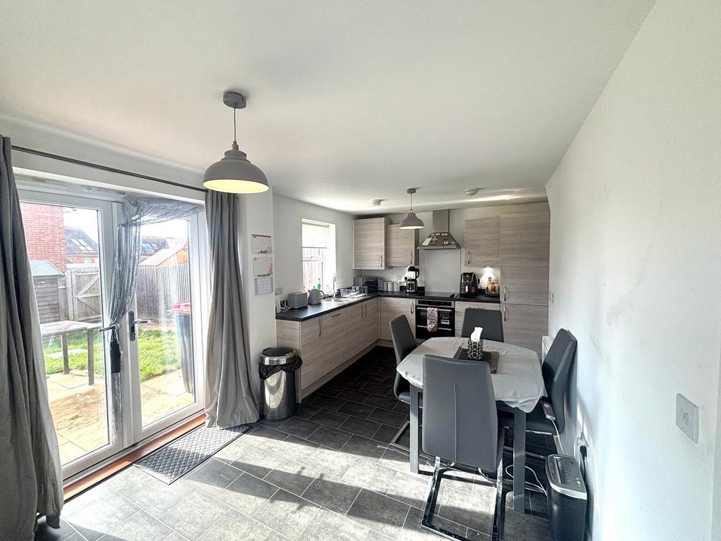 As you enter this beautiful family home, you are greeted by an entrance hall, which leads into the open plan kitchen dining room. This room seamlessly integrates the cooking and dining areas, and is beautifully illuminated by natural light streaming in through a large window above the sink and French doors, which lead into the garden. Through the kitchen is the utility room, which stores the washing machine and tumble dryer, and offers cupboards and shelves for storage space. The sitting room offers ample room for seating arrangements, making it perfect for relaxing or entertaining. The ground floor also benefits from a downstairs cloakroom.