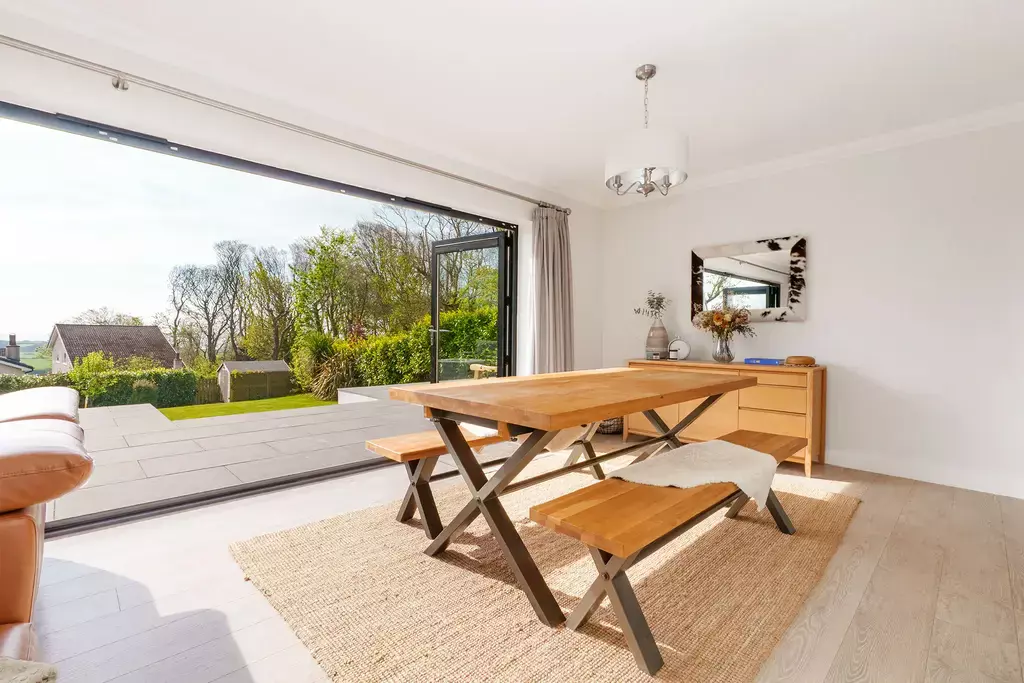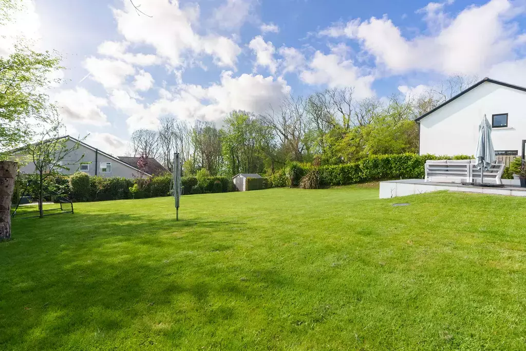 Externally, the property boasts an impressive lawned garden, garden sheds/workshop, and a superb patio area accessed via the bi-folding doors – the perfect space for alfresco dining, entertaining, or simply enjoying the peaceful setting and distant coastal views.