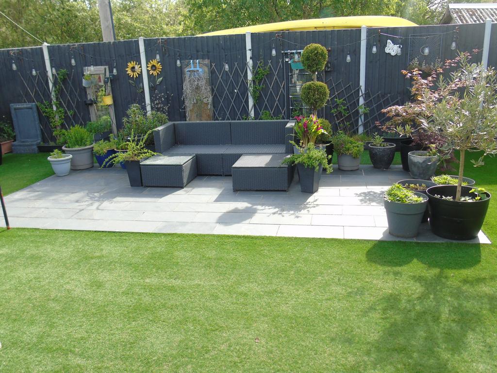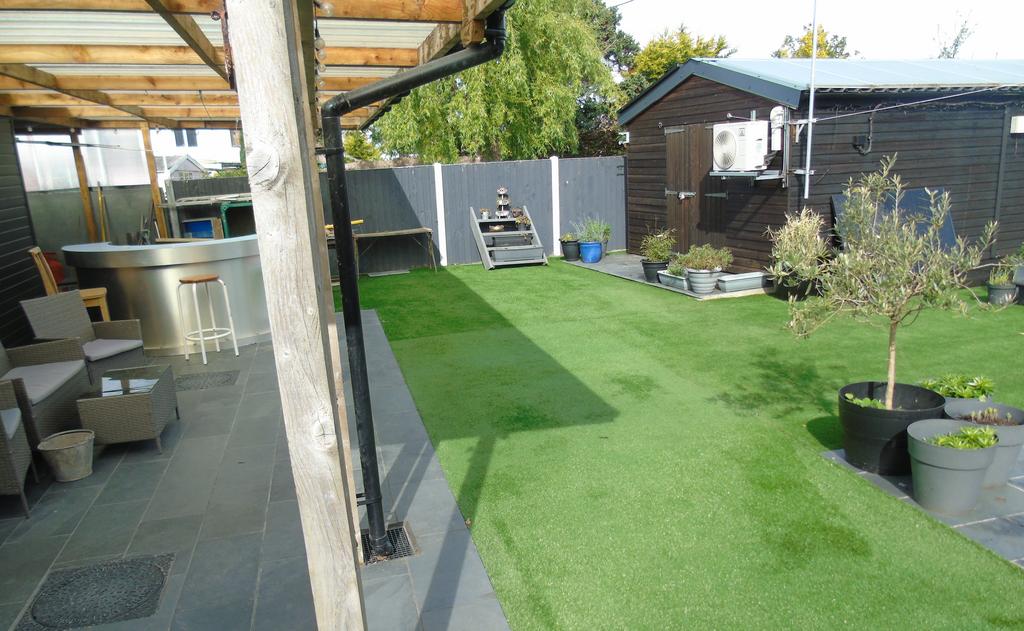 To the rear of the property is a low maintenance garden with artificial grass surfaces a covered paved sitting area with garden bar further paved areas and elevated borders.