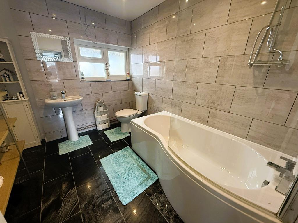 Tiled floor, panelled bath with mains shower over and glazed shower screen, low level flush WC, pedestal wash hand basin, tiling to three walls and integral lighting.
