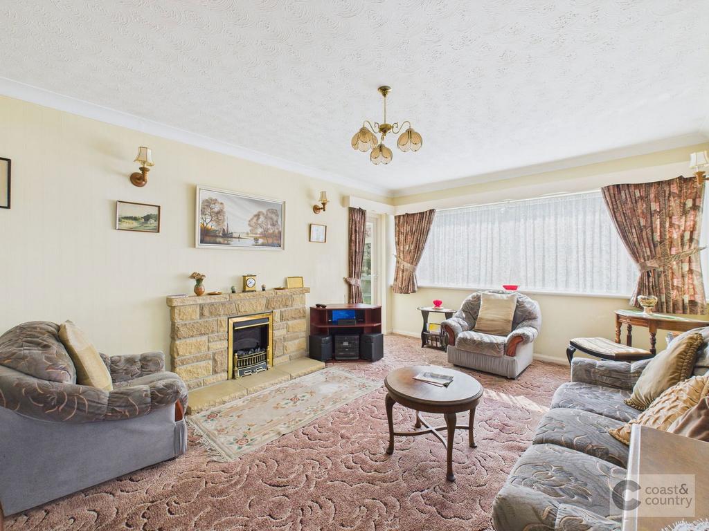 A uPVC obscure double glazed entrance door leads to the entrance hallway with wood flooring, coats cupboard and night storage heater. An obscure-glazed door leads to the lounge/dining room with feature stone fireplace and inset electric coal effect living flame fire, night storage heaters, two windows to side, window overlooking the rear garden and glazed door to conservatory with sliding doors to the garden. The kitchen has a range of wall and base units with rolled edge work surfaces, single drainer sink unit, space for appliances, breakfast bar, serving hatch to lounge, window to front and obscure glazed door to rear porch with tiled flooring, two storage cupboards, part obscure glazed door to front and door to rear garden. Bedroom one has a range of built-in cupboards, night storage heater, window to side and window to conservatory. Bedroom two has a window to front and night storage heater. The bathroom has a suite comprising panelled bath with mixer tap and shower attachment, pedestal wash basin, heated towel rail and window. There is also a separate WC with low-level WC and window.
