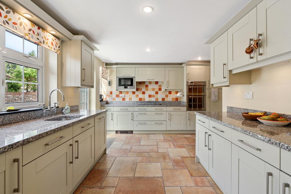 KITCHEN About 14’4” x 11’6” (4.37m x 3.51m) Inset stainless steel sink unit with ‘Quooker’ tap with cupboards and drawers under, filtered water tap, matching eye level and further base level units with granite work surfaces, integrated dishwasher, integrated refrigerator, built-in electric hob with extractor hood over, built-in double oven, built-in microwave, ceiling downlighters, double glazed window, double glazed door to garden, ceramic tiled flooring, door to stairs to basement.