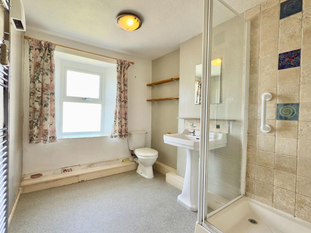 Towel rail. UPVC double glazed window to front. W.C. Wash hand basin. Corner shower cubicle with electric shower.