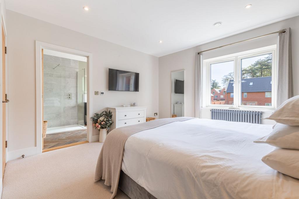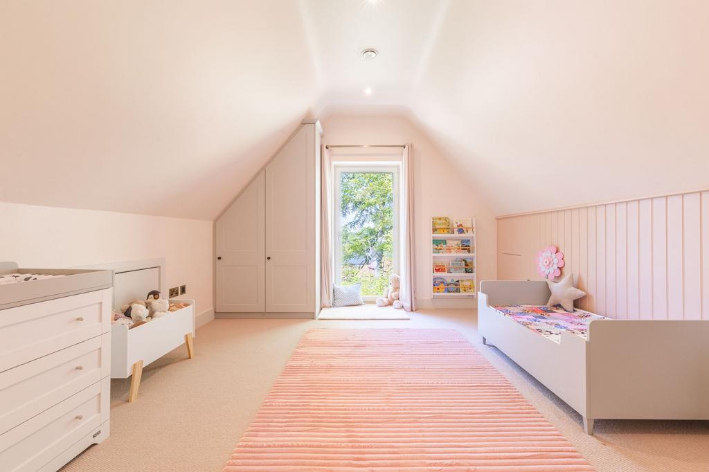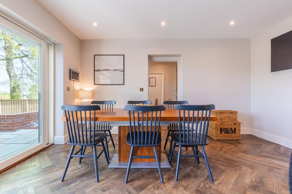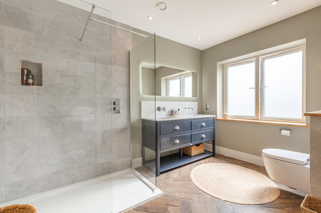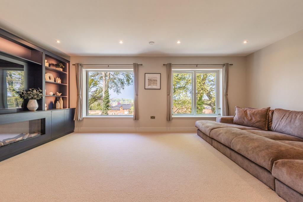 Continuing the luxurious theme, the first-floor living room includes a bespoke media unit with an integrated fire and feature LED lighting—perfect for cosy evenings while enjoying uninterrupted views across the river valley. The principal suite is also situated on the first floor and is finished to an impeccable standard, featuring a walk-in dressing room and a stylish en-suite with a double vanity unit.