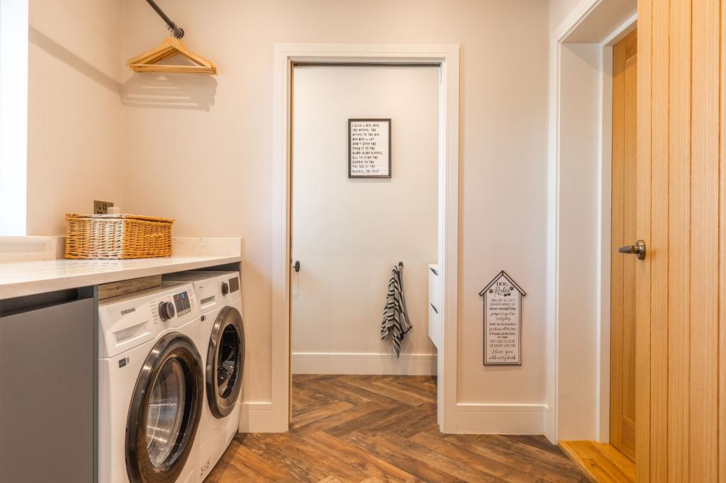 The open-plan kitchen/diner creates a seamless flow between indoor and outdoor living, extending onto a generous sandstone patio framed by brick planters. Featuring integrated Neff appliances and striking quartz worktops, it is a host’s dream. A separate snug—accessible via sliding doors—offers flexibility, allowing the space to be opened up or closed off as desired. A utility area, including a WC, further enhances the functionality of the ground floor, which offers an opulent welcome to the property.