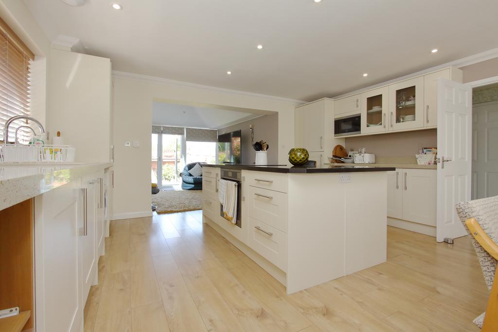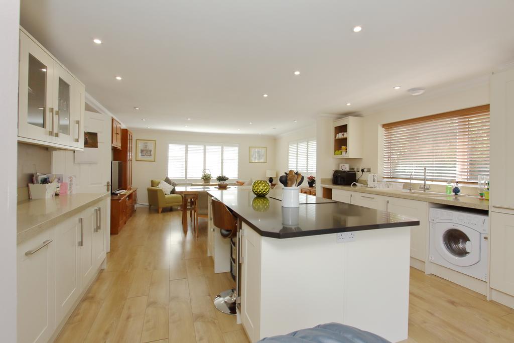 The contemporary kitchen is a chef’s dream, featuring a window to the side and a range of cream shaker-style base and wall-mounted cupboards. The work surfaces and matching upstands are complemented by top-of-the-range integrated appliances, including a dishwasher, washing machine, tall fridge-freezer, and microwave oven. A large central island serves as both a functional workspace and a social hub, with base cupboards, drawers, a built-in wine rack, and a recessed breakfast bar. The kitchen also benefits from a Nest thermostat system, recessed downlighting, and wood-effect laminate flooring. It opens into the conservatory, creating a wonderful space for entertaining or enjoying a family meal.