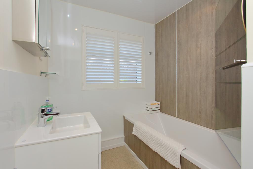 The family bathroom is equipped with a three-piece suite, including a panel bath with a mixer tap and a wall-mounted shower over. Acrylic sheeted wall panelling and a glass shower screen offer a stylish touch, while the vanity unit with inset wash basin and storage below provides practicality. Additional features include a wall-mounted cabinet, towel rail, downlighting, radiator, and vinyl flooring.