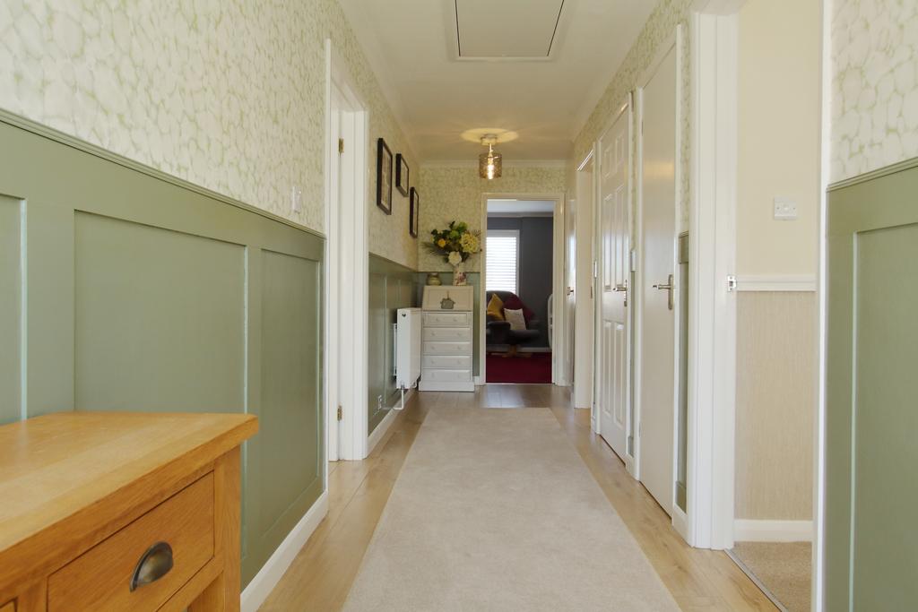 The welcoming entrance hall sets the tone for the rest of the home, with a recessed coat rack, storage cupboards, and access to the loft room via a pull-down ladder. From the hall, you’ll find the generous open-plan reception area, which provides the perfect space for family living.