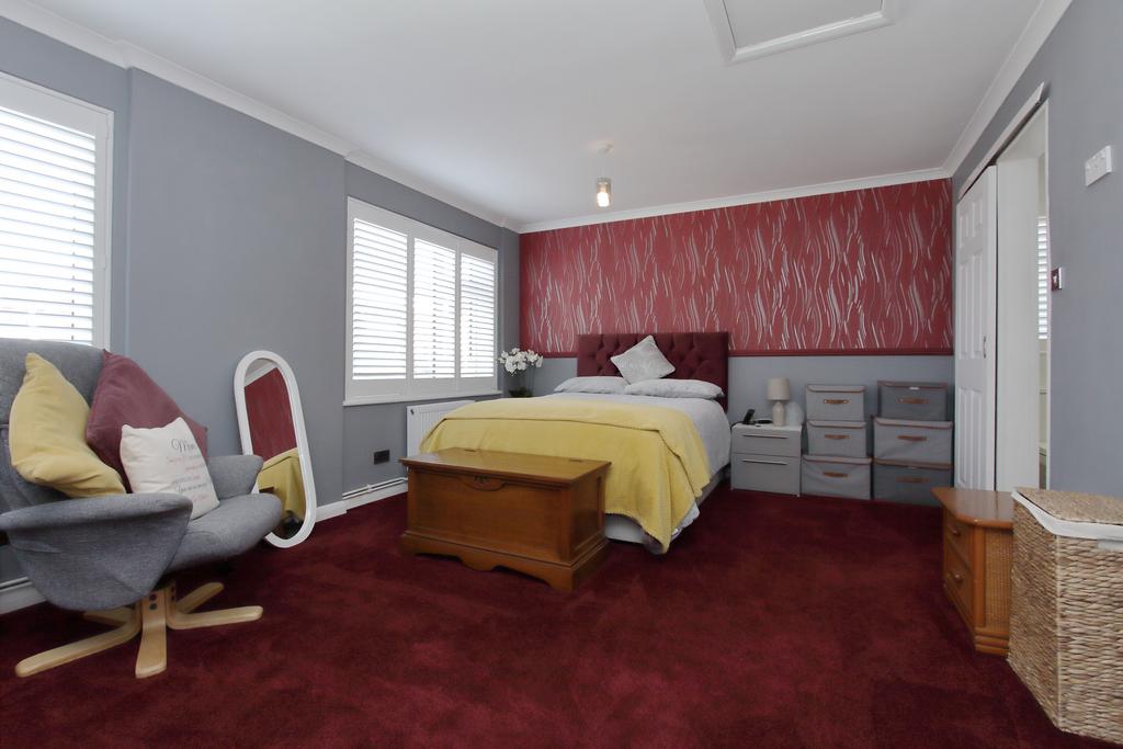 The master bedroom features two rear-facing windows with fitted shutters and provides ample space for free-standing wardrobes. It benefits from two radiators and direct access to the en-suite bathroom.