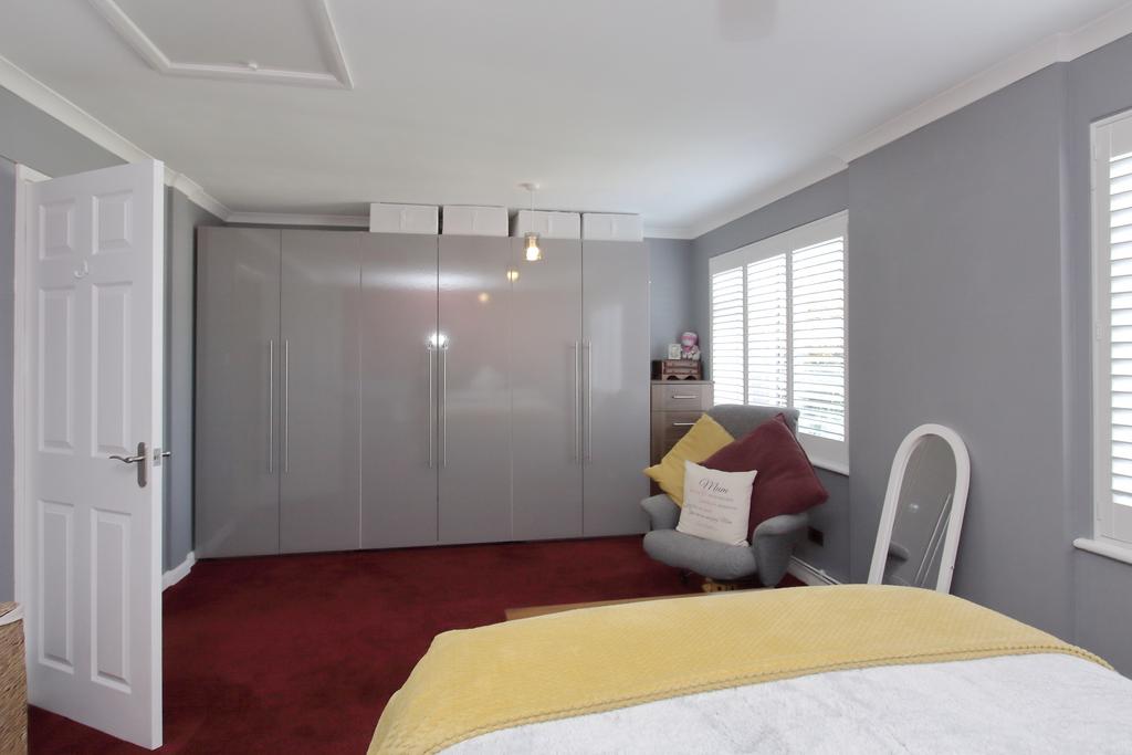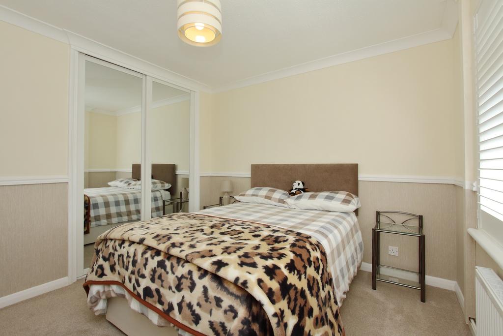 The second bedroom, which overlooks the front of the property, is a good-sized room complete with a built-in double wardrobe with sliding mirror doors. The room also features fitted window shutters, a dado rail, and a radiator.