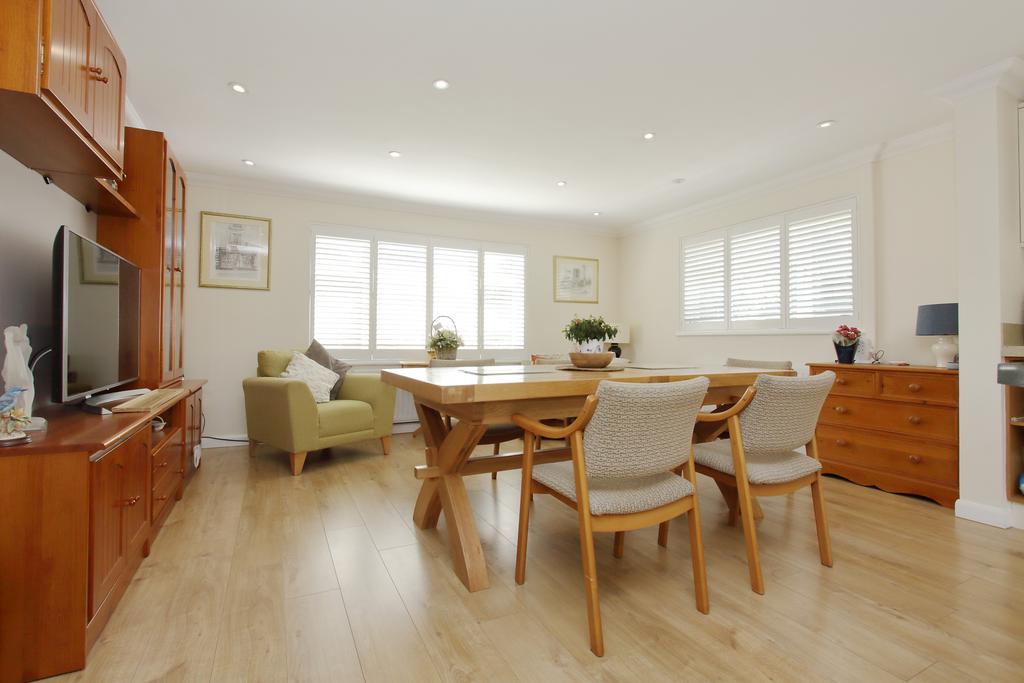 The spacious living room features dual-aspect windows to the front and side, both complete with fitted window shutters. The room is flooded with natural light, creating a warm and welcoming atmosphere. With wood-effect laminate flooring, downlighting, and a radiator, this is a space to relax and unwind. A Virgin Media connection point and a seamless open-plan flow to the kitchen make this space even more practical.