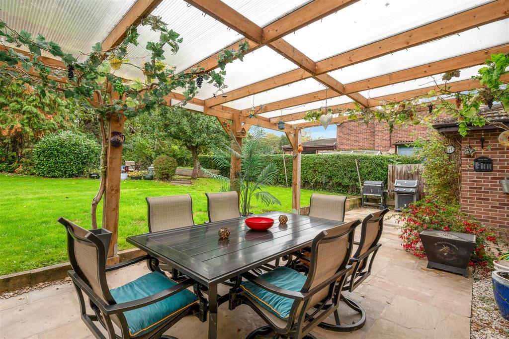 To the rear of the house are lovely enclosed gardens laid mostly to lawn. A paved patio connects to the rear of the house with a wooden pergola over providing a lovely outdoor seating area which connects to the dining room, kitchen and conservatory. The garden has views into the adjoining woodland which sits along the rear boundary.