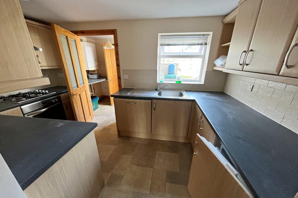 Fitted to comprise a range of base and eye level units with work surfaces, single drainer sink unit with tiled splashback, gas hob with oven and extractor, integrated dishwasher and fridge, door to utility, double glazed window to rear