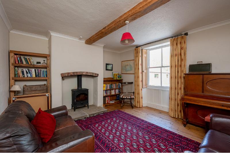 Internally, beyond the entrance lobby, the ground floor benefits from a cozy reception room, with a wood burning stove and a generously sized lounge with an open fire. The fully equipped kitchen complimented by an electric Aga is at the heart with adjoining utility room, downstairs we, walk in pantry and a staircase leading to a dry cellar. On the half landing is a double bedroom and bathroom.
