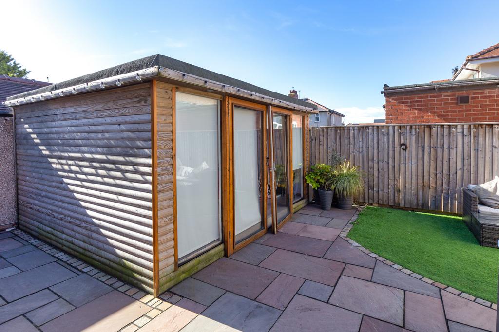 Outside, the rear garden has been designed for low maintenance and year-round enjoyment. Indian stone paving creates an elegant patio area, while a section of artificial lawn offers a pop of greenery. The high-spec hot tub takes centre stage, providing the ultimate spot to unwind, and a timber-clad garden room with sliding doors offers a brilliant bonus space—whether you-re after a home gym, games room or office.