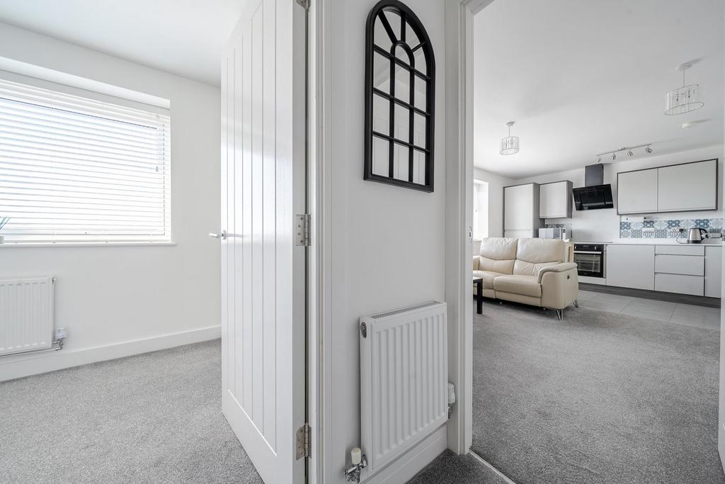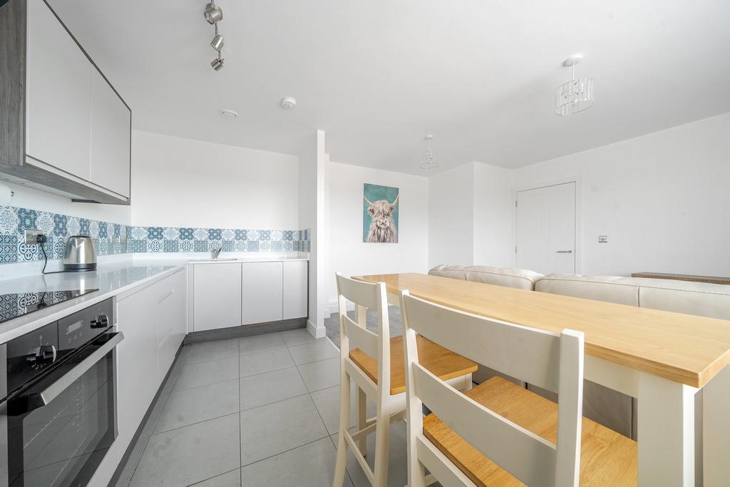17' 7" x 14' 0" (max) (5.36m x 4.27m max) Kitchen area with a range of wall and base units with quartz worksurfaces and upstands over. Inset stainless steel sink, drainer and mixer tap over. Integrated oven and electric hob with quartz splashback and extractor hood over. Integrated washing machine, dishwasher and fridge/freezer. Ceramic tiled flooring.