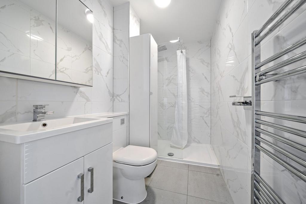 Suite comprising vanity wash hand basin, low level WC and double shower cubicle. Extractor fan. Tiled walls and ceramic tiled flooring. Chrome heated towel rail.