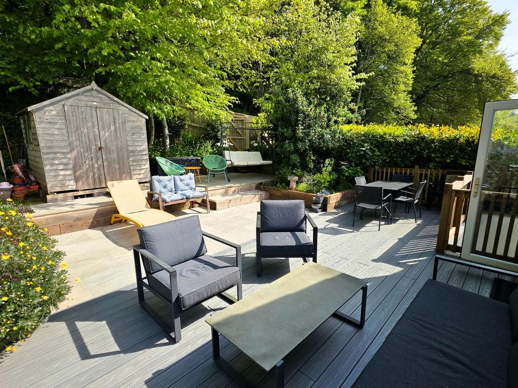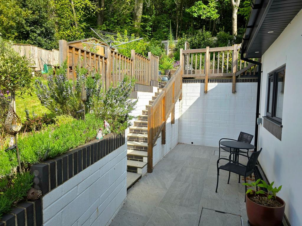The rear garden is a particular feature of the property which has been landscaped and backs onto Brunel Woods with access gate. Directly outside bedroom two is a composite decked terrace which leads onto a paved terrace with two steps to a further smaller patio with garden shed. To the side is a gently sloping lawned garden leading to a vegetable garden beyond with further timber garden shed. There are an abundance of mature plants, shrubs and trees surrounding the gardens with fenced and hedged boundaries and enjoys a good degree of sunshine. Steps lead down to a further patio area which in turn leads to the front of the property with ample driveway parking.